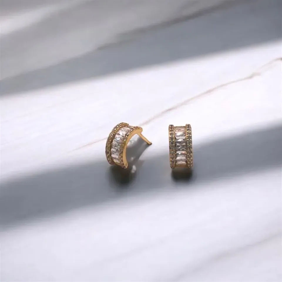 O Brinco Meia Argola Cravejado na Navete tamanho PP com Banho em Ouro 18k é uma peça delicada e sofisticada, ideal para quem busca um acessório discreto e elegante.