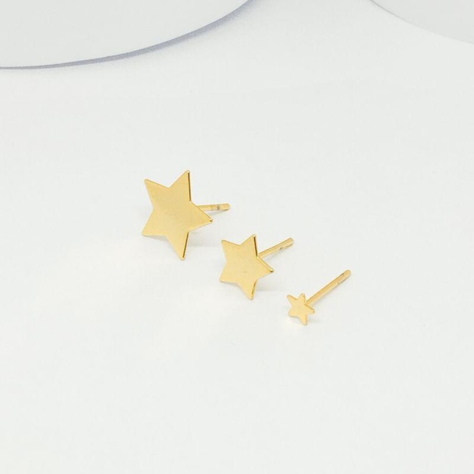Composto por três brincos pequenos em formato de estrela lisa, o trio traz um design minimalista e sofisticado, perfeito para complementar qualquer look com um toque de elegância.