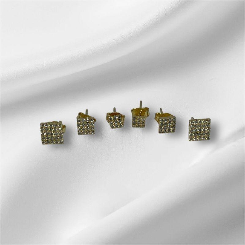 Composto por três brincos no formato losango, cada peça é cuidadosamente cravejada com zircônias, proporcionando um brilho intenso e sofisticado.