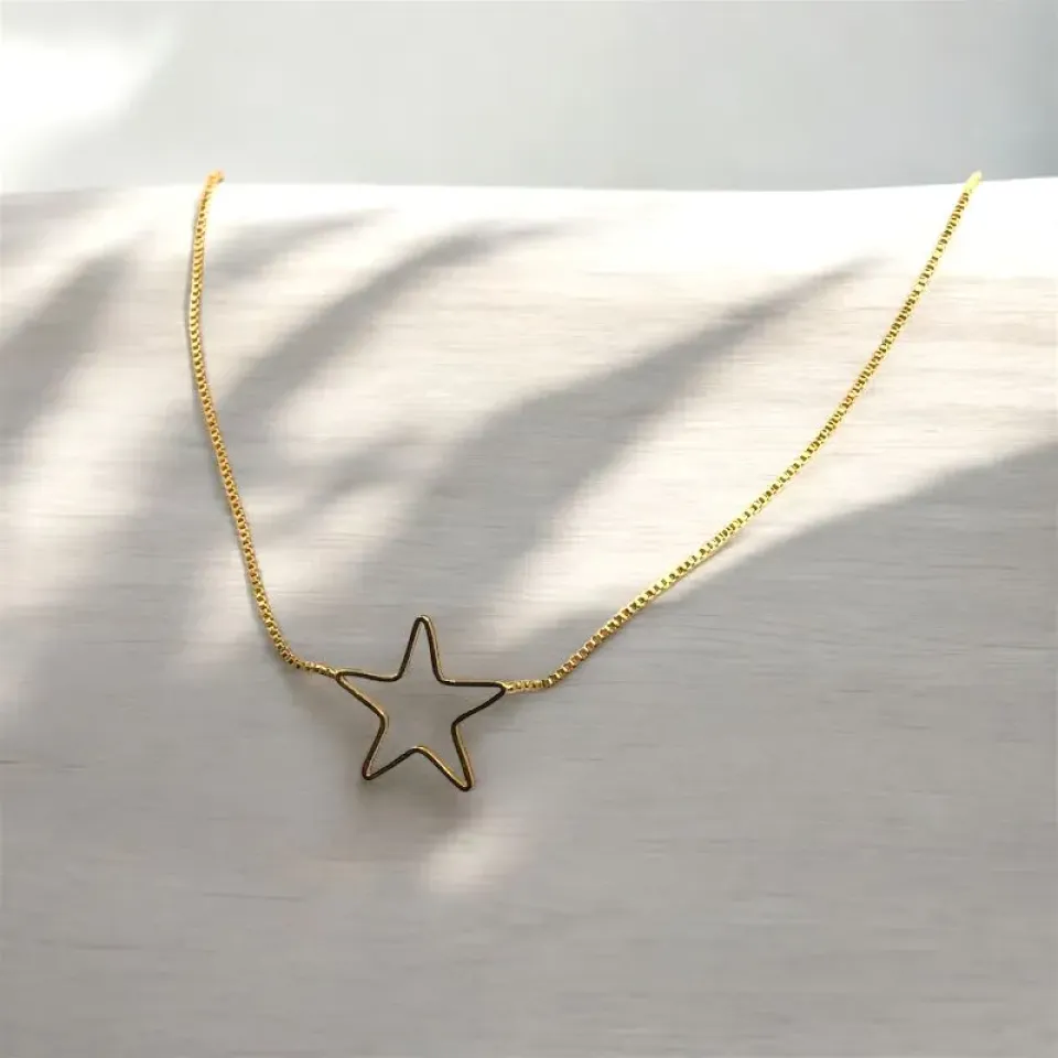 O pingente em formato de estrela grande vazada traz um toque especial de leveza e brilho, simbolizando inspiração e luminosidade.