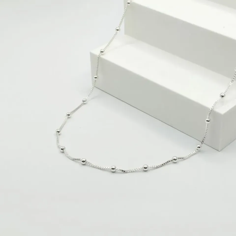 O Colar Veneziana com Bolinhas Lisas com Banho em Prata é uma peça delicada e sofisticada, que combina o charme da corrente veneziana com a suavidade das bolinhas lisas. A corrente, com seu design fino e simétrico, proporciona um caimento elegante e confortável ao redor do pescoço. As bolinhas lisas, distribuídas ao longo da corrente, adicionam um toque sutil e moderno, criando um visual leve e delicado.