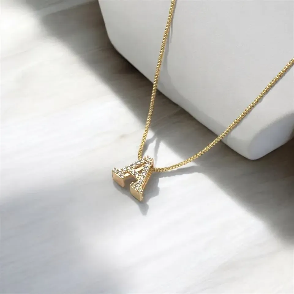 O pingente em formato da letra A é cuidadosamente cravejado com pedras brilhantes, adicionando um toque de glamour e sofisticação à peça.