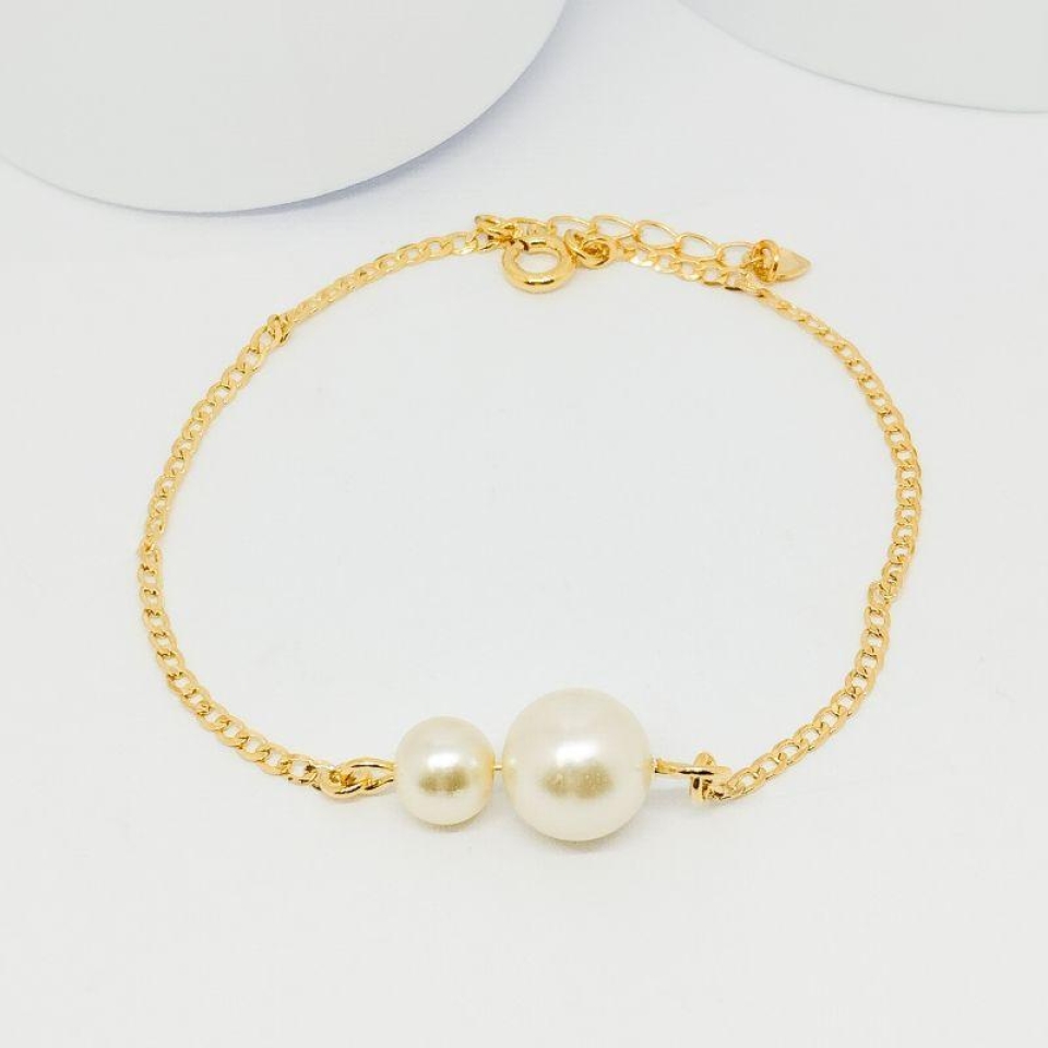 Pulseira elo oval com dupla pérola, um acessório delicado e sofisticado que une o clássico ao moderno em um design elegante.