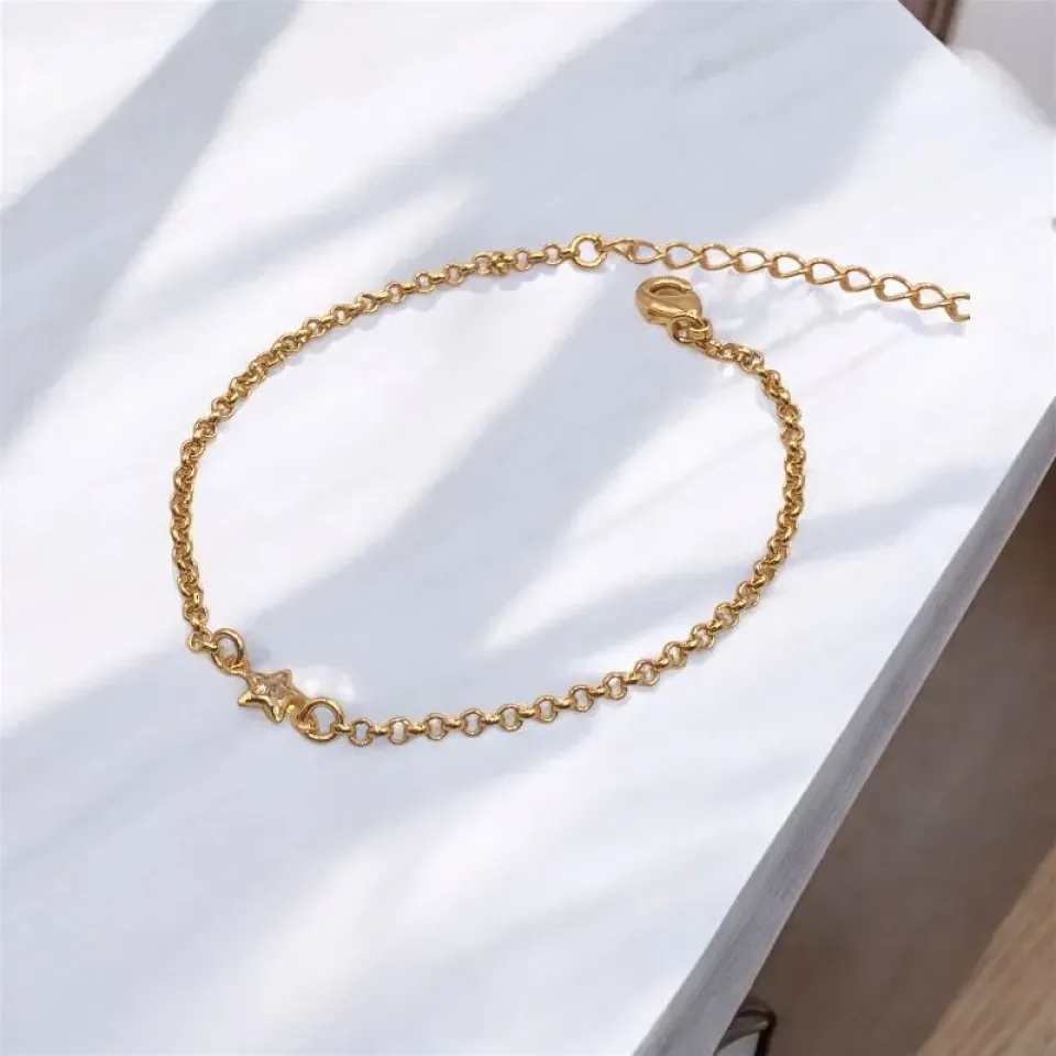 Essa pulseira em banho de Ouro 18K é uma peça encantadora que combina a suavidade da corrente com o brilho delicado de um pingente de estrela lisa. O design sofisticado e moderno da pulseira é realçado pela estrela minimalista, que traz um toque de brilho e elegância ao conjunto.