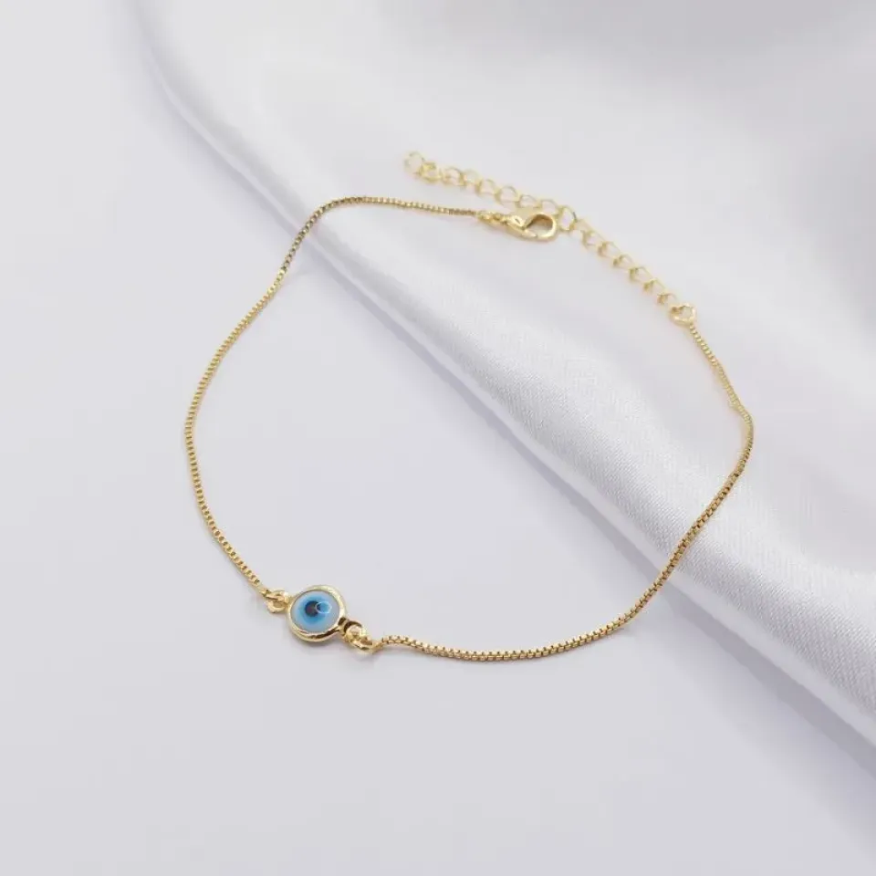Com design elegante, a tornozeleira conta com a clássica corrente veneziana, conhecida pelo seu brilho sutil e caimento leve. O destaque fica por conta do pingente de Olho Grego, símbolo de proteção contra energias negativas e mau-olhado, trazendo um toque místico ao visual.